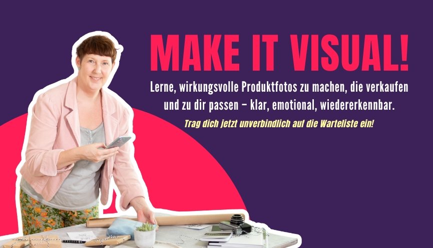 Komm unverbindlich auf die Warteliste, und sobald die Anmeldung wieder geöffnet ist, erhältst du eine ausführliche Info in Form einer Angebotsseite mit allen Details zum Kursprogramm & Preisplänen. Zur Orientierung: Das Invest für MAKE IT VISUAL wird bei 650,- Euro liegen – Das Programm öffnet wieder Ende August.